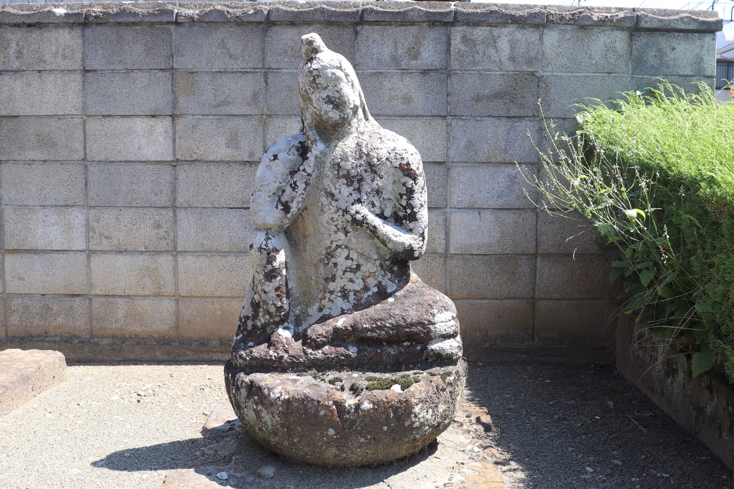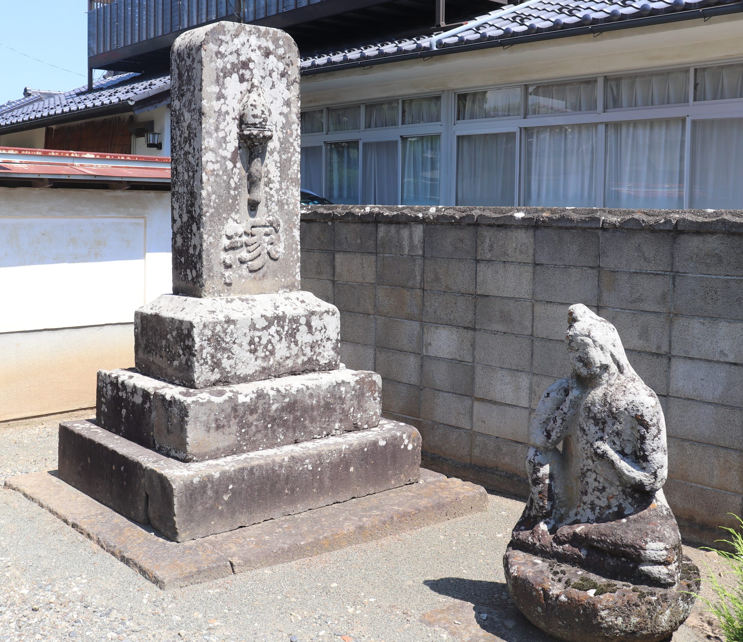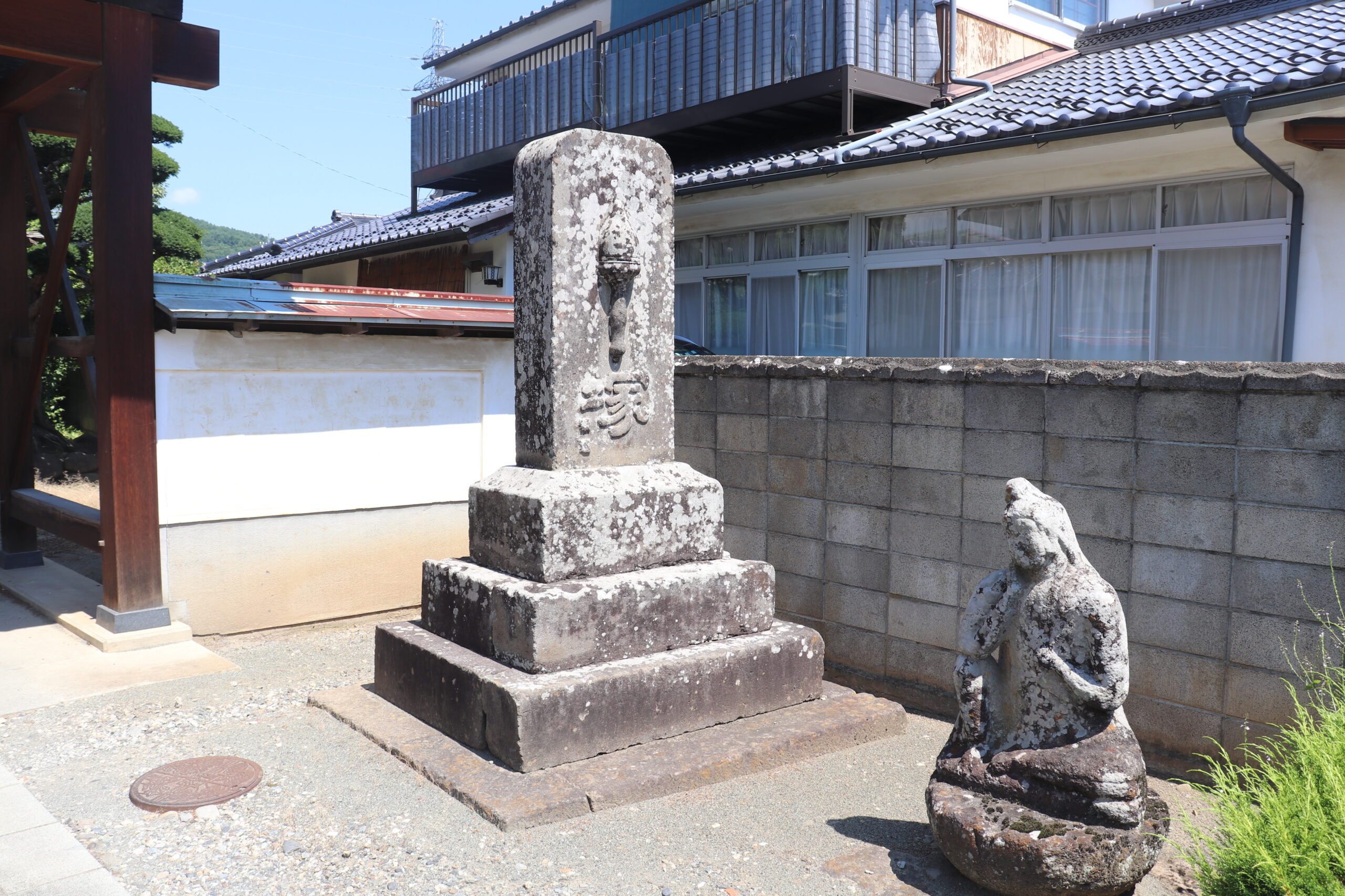 山門前には珍しい筆塚と石仏があり、石仏は「歯痛止めの弥勒様」と呼ばれ、歯が痛い時に一つの呪文を唱えて弥勒様に願うと、立ちどころに痛みが止まると言われている。